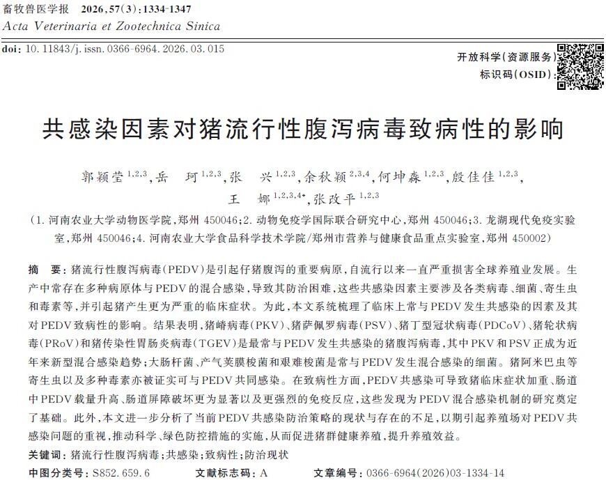 《畜牧兽医学报》2026年第57卷第3期刊登了河南农业大学动物医学院等单位郭颖莹, 岳珂, 张兴, 余秋颖, 何坤淼, 殷佳佳, 王娜, 张改平的文章——“共感染因素对猪流行性腹泻病毒致病性的影响”,该文由河南省重大科技专项项目(221100110600)资助。该综述的亮点:本文首次系统揭示了PKV和PSV作为PEDV新兴共感染趋势(2015年后检出率跃升至15.79%和9.03%),阐明了病毒-细菌-毒素协同破坏肠道三重屏障、促进病毒复制并诱发过度免疫反应的致病机制,并提出"禁抗"背景下植物源性药物作为PEDV共感染绿色防控新策略.导读 前言PEDV是仔猪腹泻的...