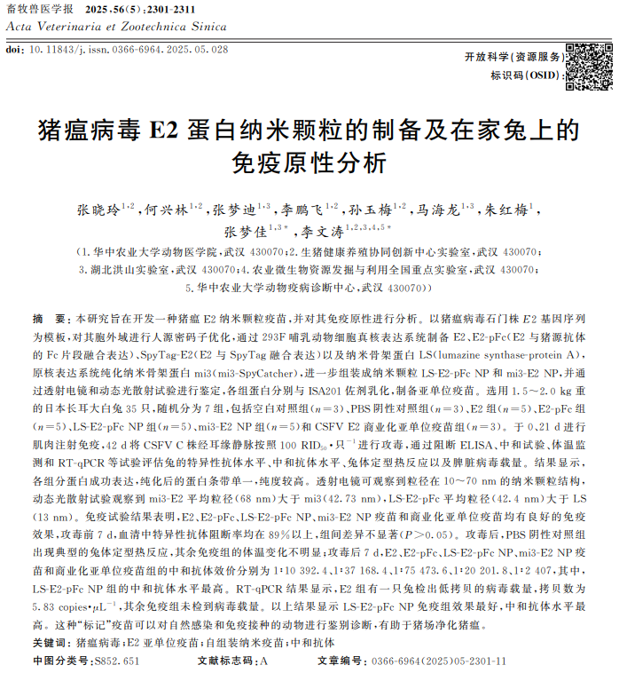 《畜牧兽医学报》2025年第56卷第5期刊登了华中农业大学动物医学院等单位张晓玲, 何兴林, 张梦迪, 李鹏飞, 孙玉梅, 马海龙, 朱红梅, 张梦佳, 李文涛的文章——“猪瘟病毒E2蛋白纳米颗粒的制备及在家兔上的免疫原性分析”,该文由国家现代农业产业技术体系(CARS-35);影子科技-华中农大健康食品产业研究院项目-猪场重大疫病监测与预警创新平台建设(IRIFH202209)资助。该研究的创新点在于1)新型纳米颗粒疫苗的开发:利用猪瘟病毒E2蛋白,通过293F哺乳动物细胞真核表达系统和原核表达系统,成功制备了E2、E2-pFc、SpyTag-E2和纳米骨架蛋白LS及mi3-SpyCatch...