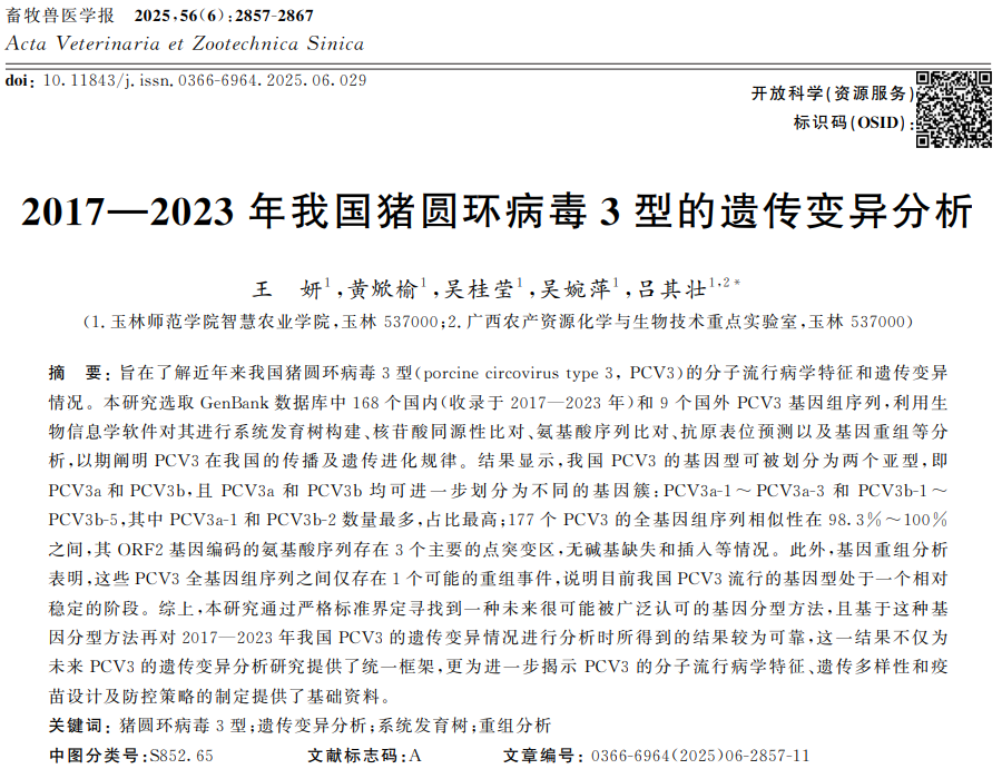 《畜牧兽医学报》2025年第56卷第6期刊登了玉林师范学院智慧农业学院等单位王妍, 黄焮榆, 吴桂莹, 吴婉萍, 吕其壮的文章——“2017—2023年我国猪圆环病毒3型的遗传变异分析”,该文由广西自然科学基金项目(2025GXNSFAA069089);玉林师范学院大学生创新创业训练计划项目(202410606041)资助。该研究的创新点:本研究创新性地提出了一种新的PCV3基因分型方法,综合考虑遗传距离、分支节点置信度和序列数量,克服了传统分型方法的局限。同时,全面分析了2017—2023年我国PCV3的遗传变异情况,揭示了主要流行的亚型和Cap蛋白的关键突变位点,为PCV3的分子流行病学研...