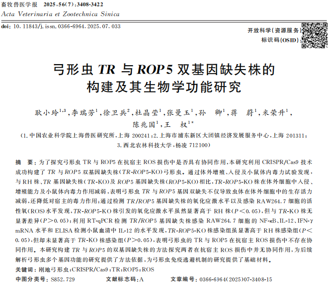 《畜牧兽医学报》2025年第56卷第7期刊登了中国农业科学院上海兽医研究所等单位耿小玲, 李瑞芳, 徐卫兵, 杜晶莹, 张曼玉, 孙卿, 蒋蔚, 米荣升, 陈兆国, 王权的文章——“弓形虫TR与ROP5双基因缺失株的构建及其生物学功能研究”,该文由上海自然科学基金(22ZR1476000);上海市科技兴农项目(2022-02-08-00-12-F01085)资助。该研究的创新点:1)成功构建了弓形虫TR与ROP5双基因缺失株,为研究这两个基因在弓形虫致病机制中的协同作用提供了新的模型。2)系统研究了双基因缺失株的体外增殖、入侵能力、体内毒力,以及氧化应激水平和对宿主免疫反应的影响,全面揭示了T...