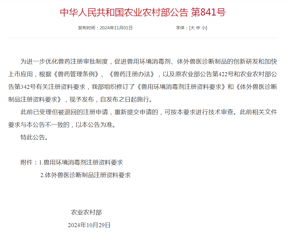中华人民共和国农业农村部公告 第841号发布时间:2024年11月01日字体:[大 中 小] 为进一步优化兽药注册审批制度,促进兽用环境消毒剂、体外兽医诊断制品的创新研发和加快上市应用,根据《兽药管理条例》、《兽药注册办法》,以及原农业部公告第422号和农业农村部公告第342号有关注册资料要求,我部组织修订了《兽用环境消毒剂注册资料要求》和《体外兽医诊断制品注册资料要求》,现予发布,自发布之日起施行。此前已受理但被退回的注册申请,重新提交申请的,可按本要求进行技术审查。此前相关文件要求与本公告不一致的,以本公告为准。特此公告。 附件:1.兽用环境消毒剂注册资料要求 ...